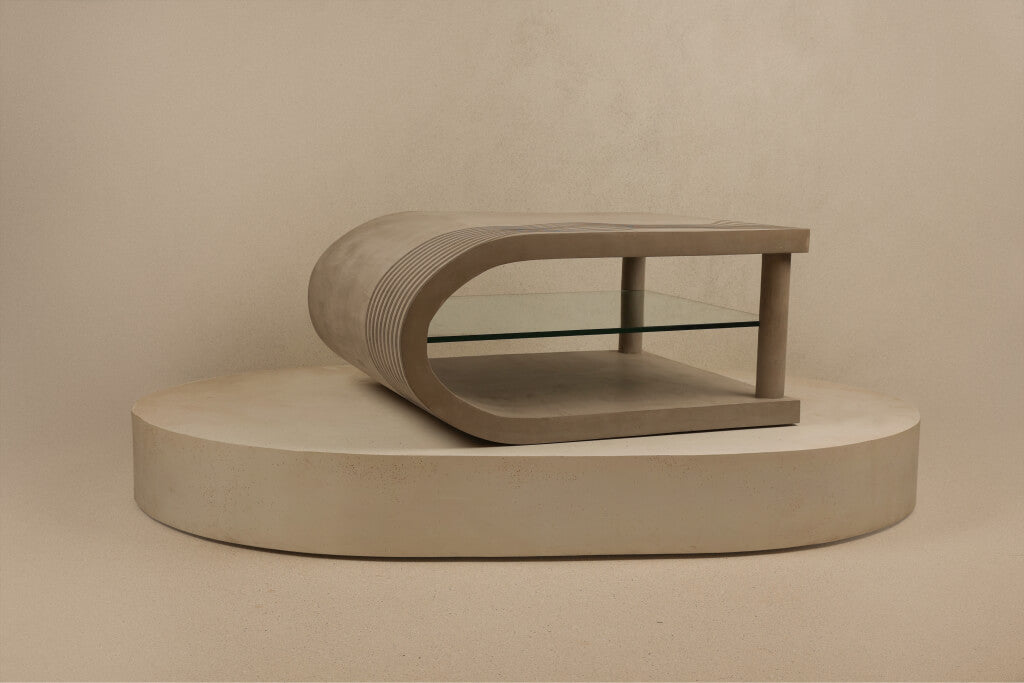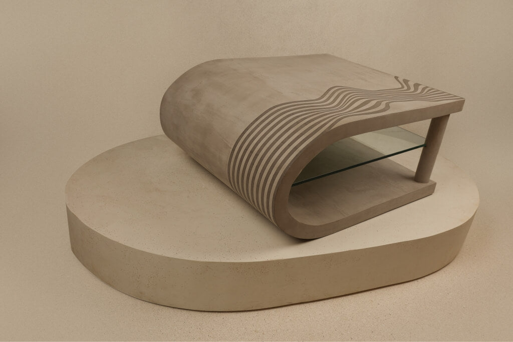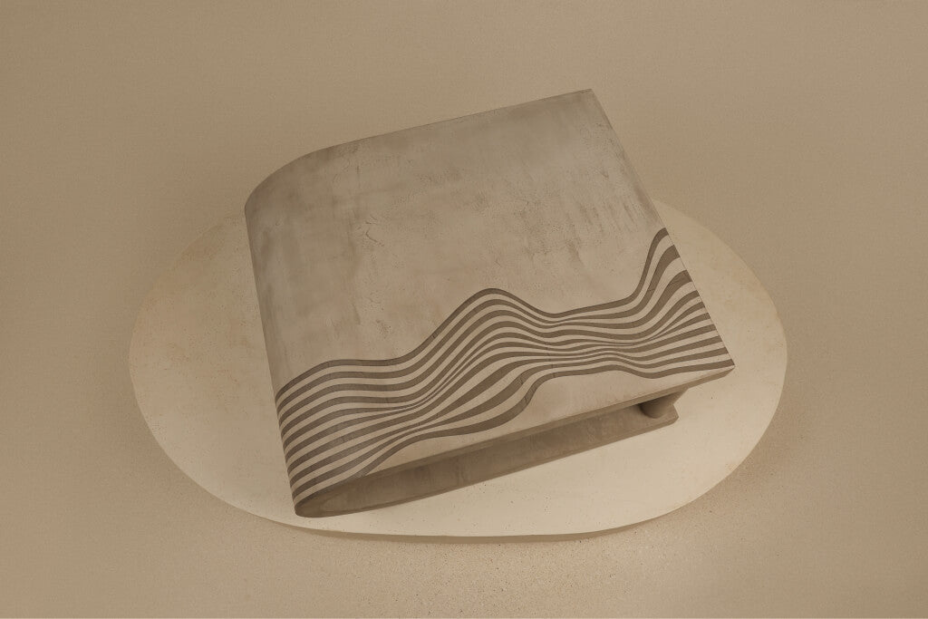 Fold Verse is a poetic coffee table characterized by its folded design, reminiscent of origami artistry. The muted grey concrete color adds a modern touch, while a graphic print enhances the visual movement of the folds. This table combines functionality with artistic expression, creating a captivating focal point in any living space. FoldVerse invites you to appreciate the beauty of form and texture, making it a sophisticated addition to contemporary interiors that value both style and substance.
